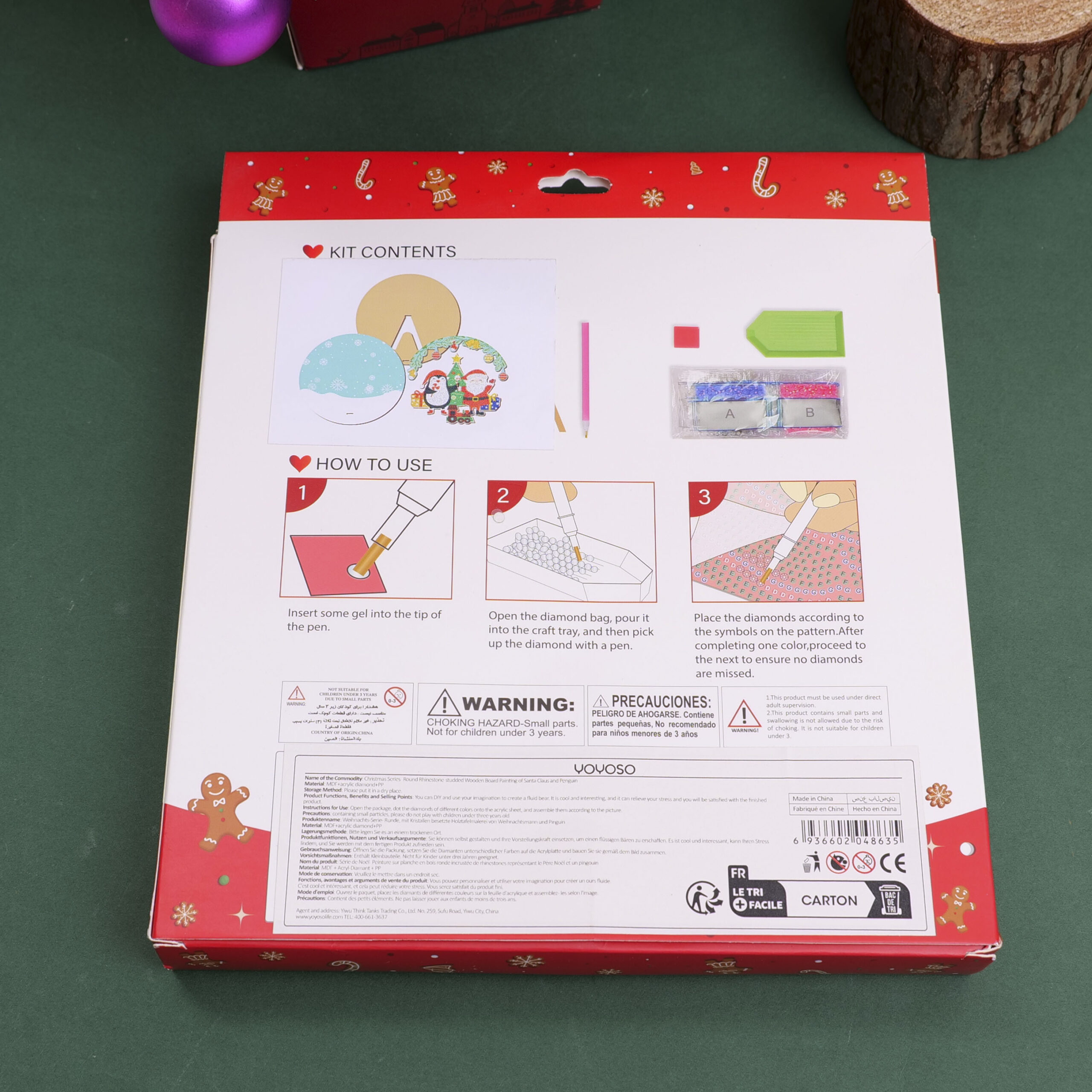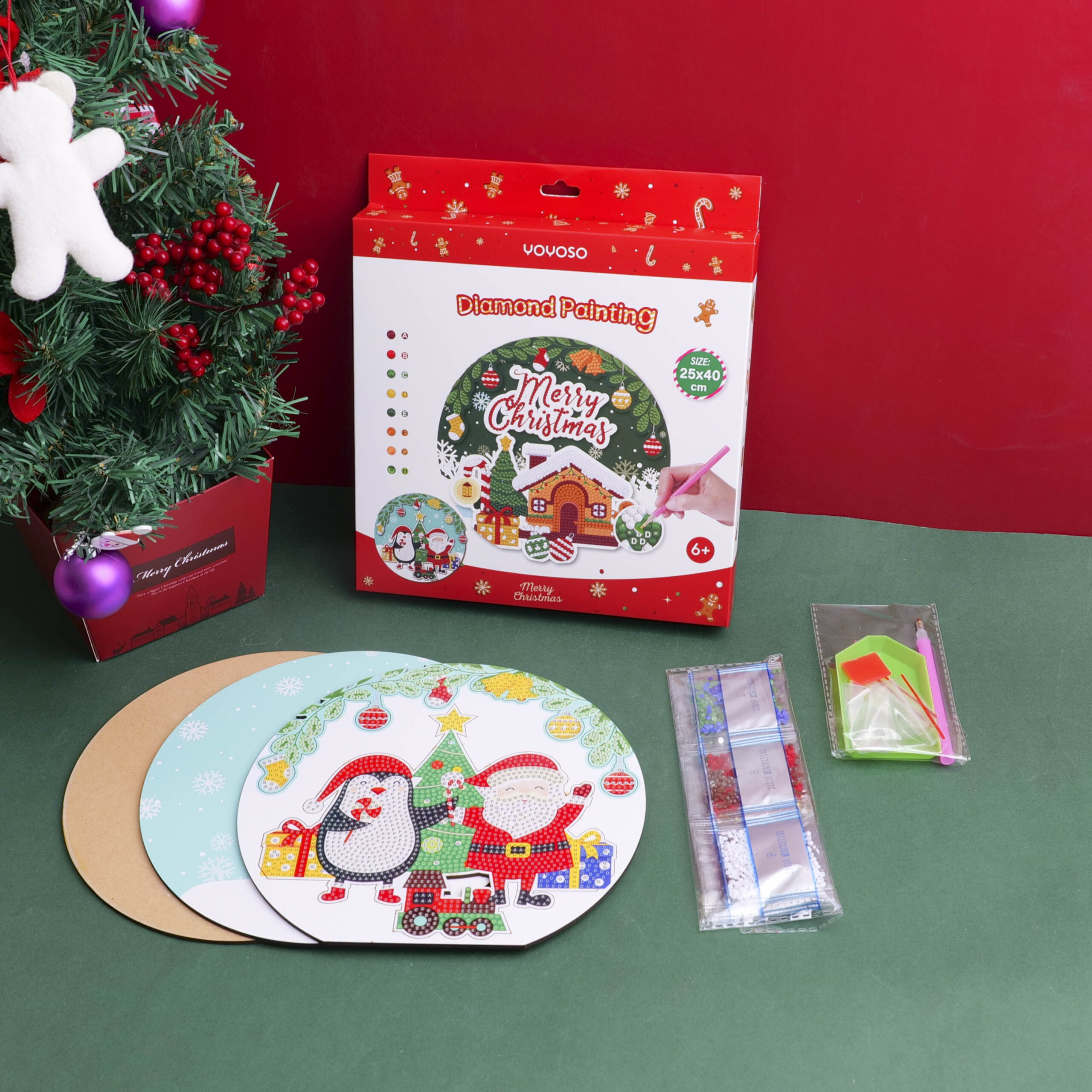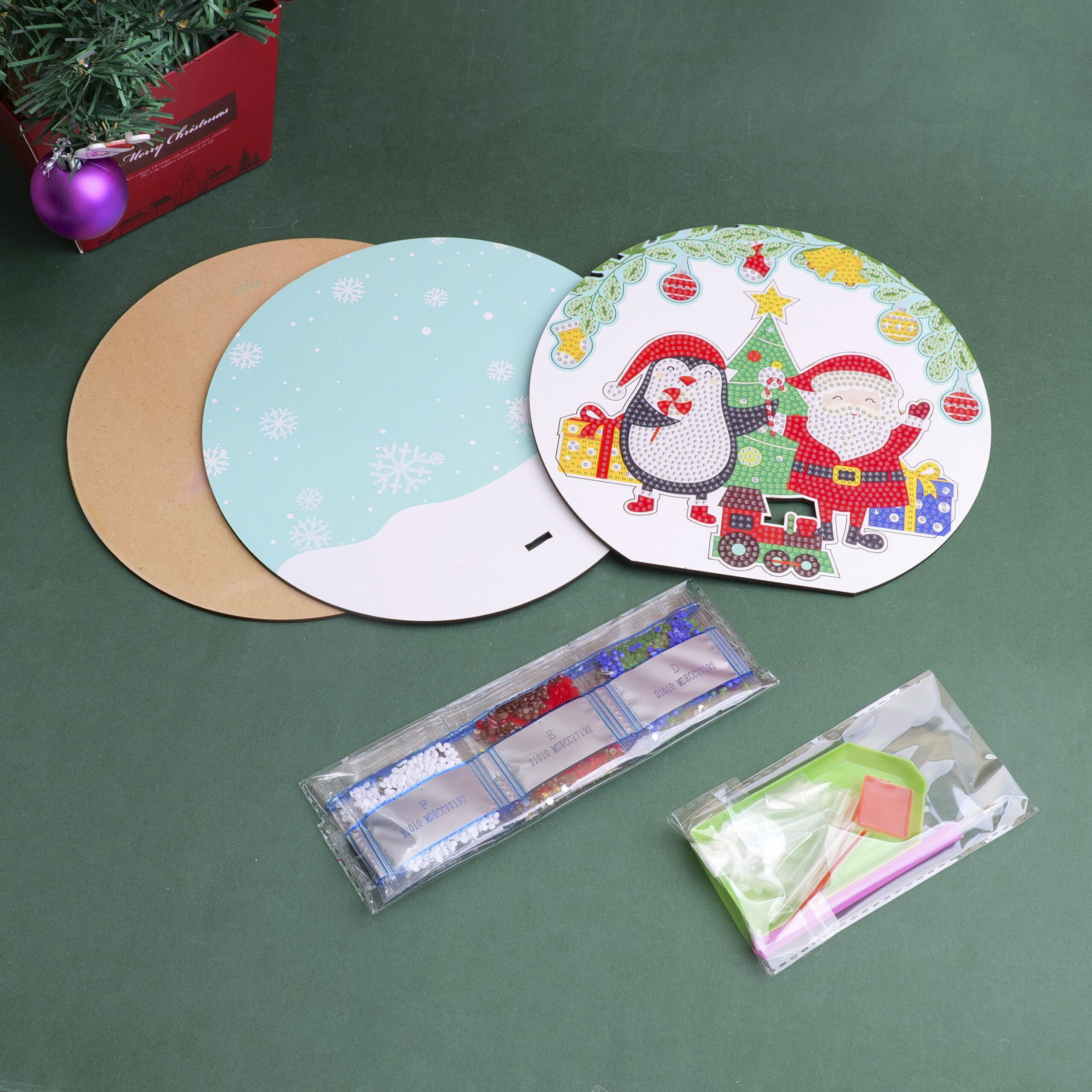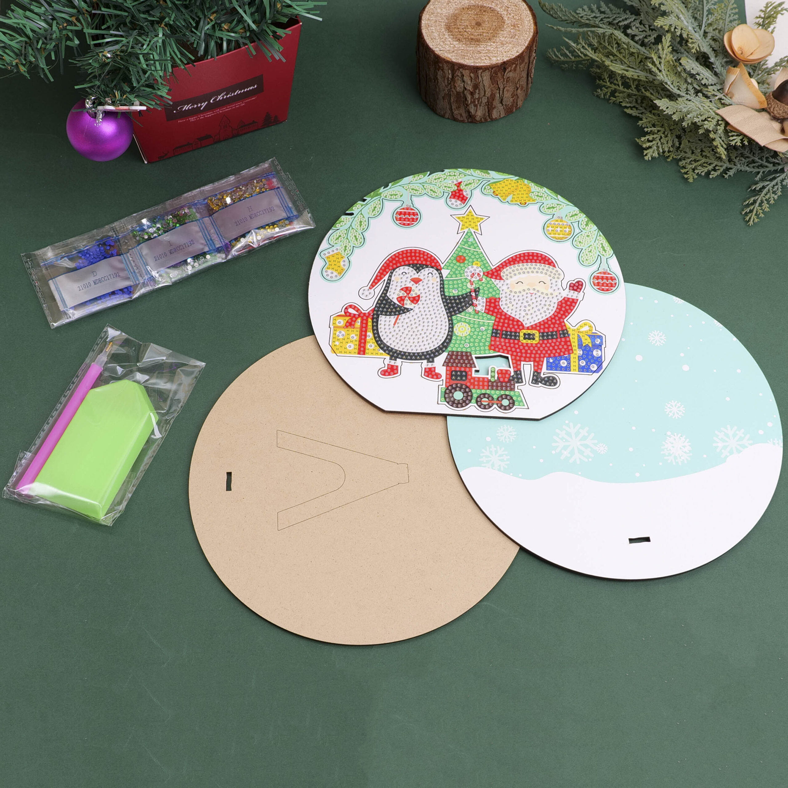 DIY Christmas Series – Χριστουγεννιάτικη Ζωγραφική με Διαμαντάκια Άγιος Βασίλης και Πιγκουίνος σε Στρογγυλή Ξύλινη Βάση